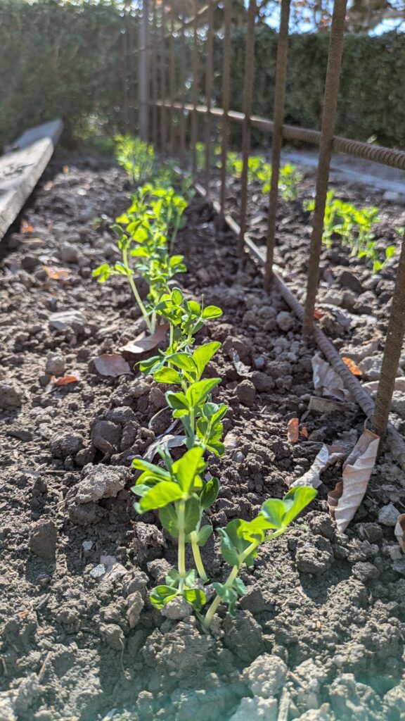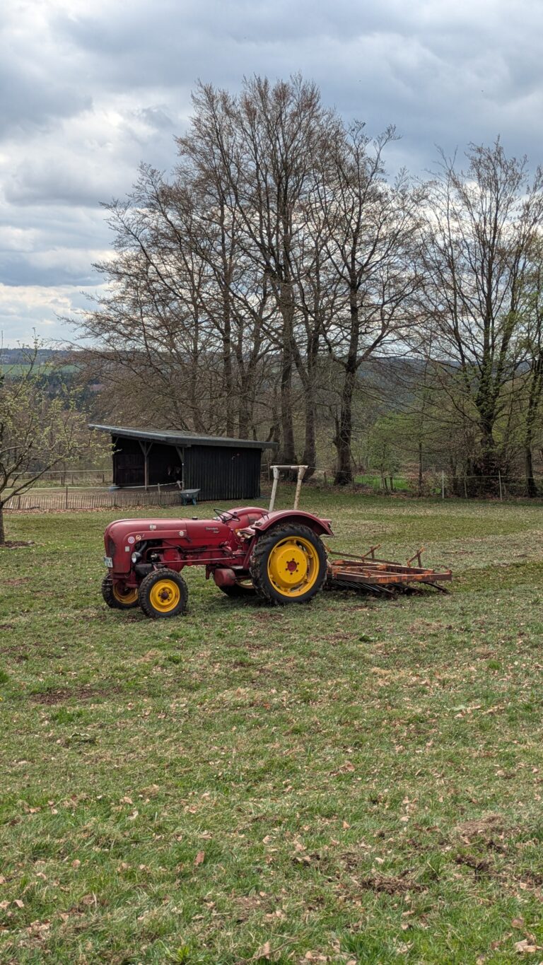Die Wiese der Ponys wird abgeschleppt, das heißt, die Maulwurfshügel und Unebenheiten und auch die ganzen Haufen aus meinem KompostMist werden glatt gezogen und verteilt. Der Garten sieht noch etwas leer aus – ist er auch. Bis jetzt habe ich nur Zwiebeln gesteckt, Kohlrabi gesetzt und halt die vorgezogenen Erbsen – und zwei Reihen rote Beete gesäät. Aber den Samen wird es noch zu kalt sein.