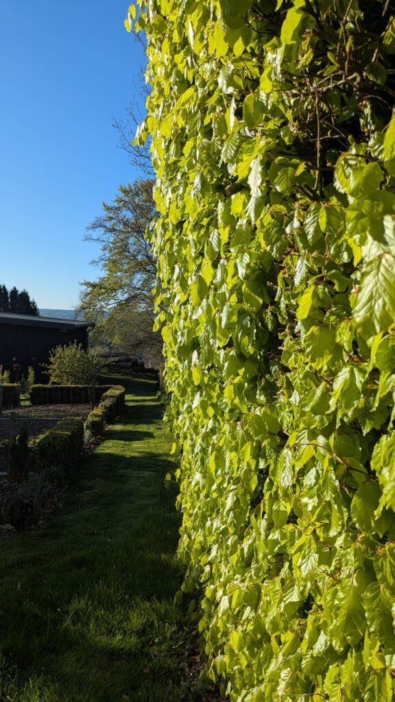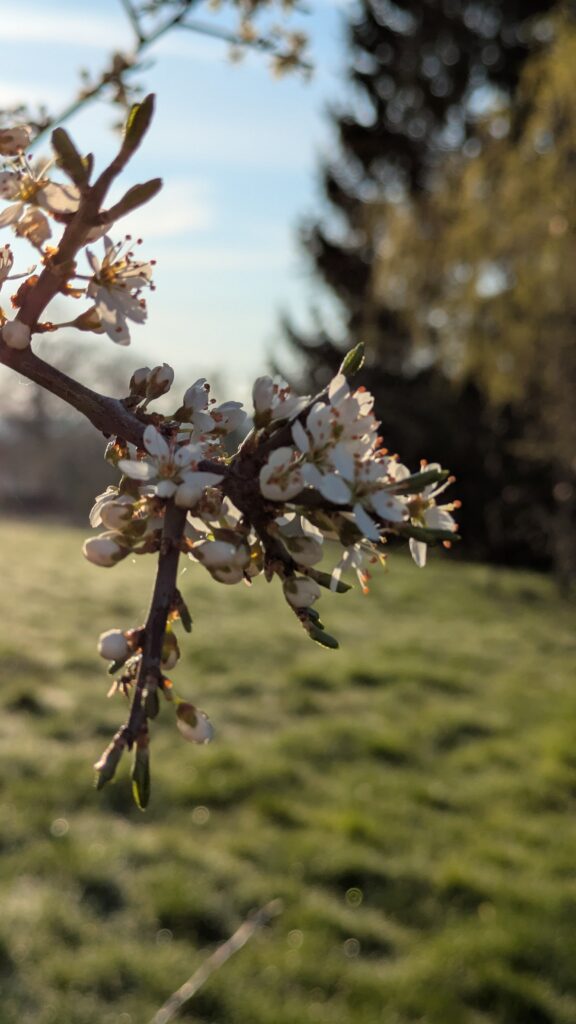 Aber es wächst – es wird grün. Die Buchenhecke wird dicht und wieder zum Sichtschutz. Die vorgezogenen Erbsen verharren in Wartestellung. Die Kirschen blühen, egal, ob die weißen Blüten, die auch rote Kirschen ergeben, oder die rosafarbenen, die nur schön aussehen und heute mit dem Wind – wie Schneeflocken – zu Boden, auf den Rasen segeln.